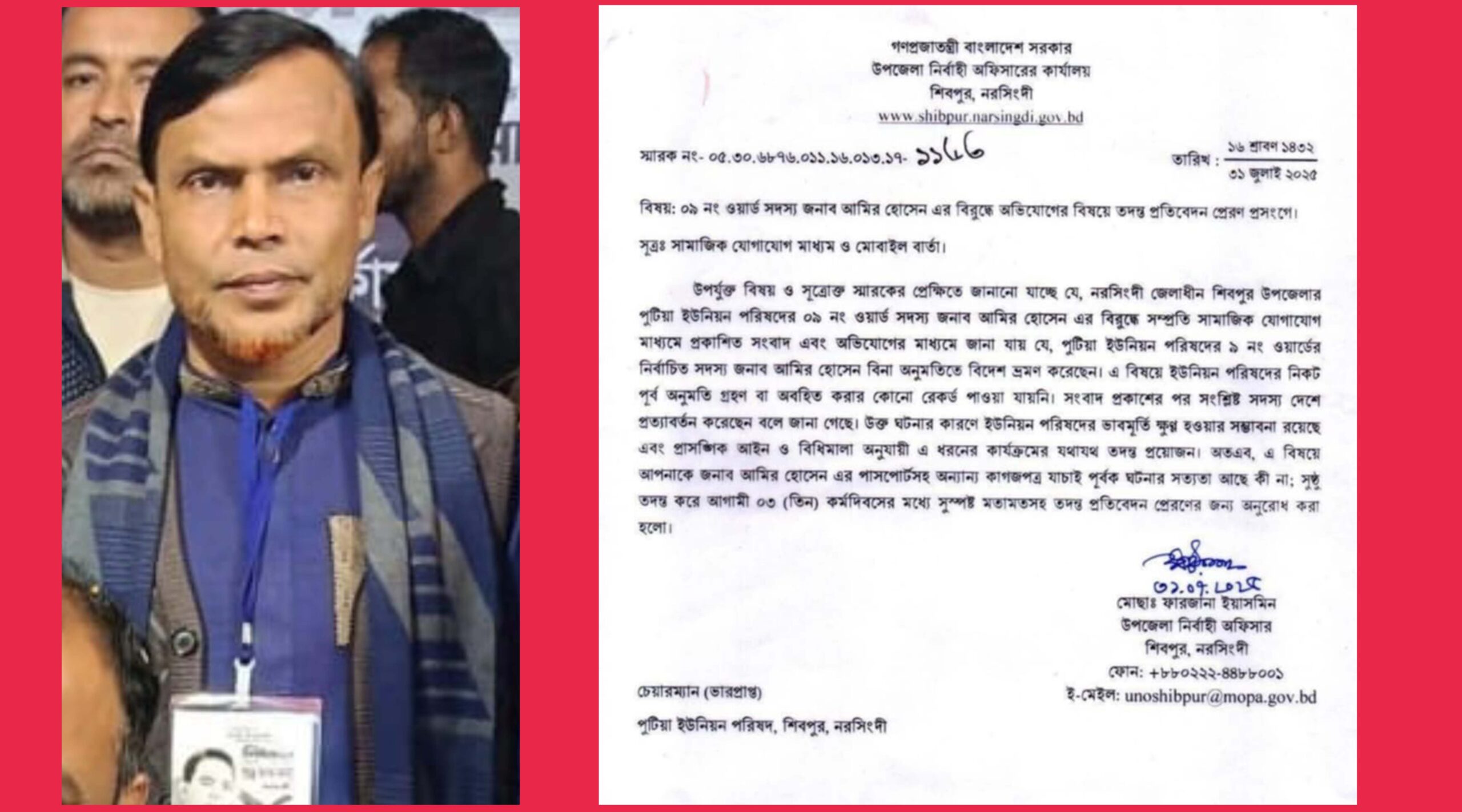 নরসিংদীর শিবপুর উপজেলার পুটিয়া ইউনিয়ন পরিষদের ৯ নম্বর ওয়ার্ডের নির্বাচিত সদস্য জনাব আমির হোসেনের বিরুদ্ধে ইউনিয়ন পরিষদের অনুমতি ছাড়া বিদেশ ভ্রমণের অভিযোগ উঠেছে। একজন জনপ্রতিনিধির এমন আচরণ শুধু প্রশাসনিক দিক থেকেই নয়, সামাজিক ও নৈতিক দিক থেকেও প্রশ্নবিদ্ধ বলে মনে করছেন এলাকাবাসী।